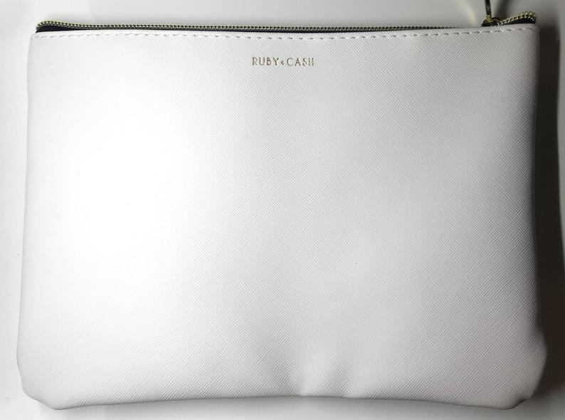 Ruby + Cash vinyl pouch finishes just under 7” x 5”. Inside is lined.